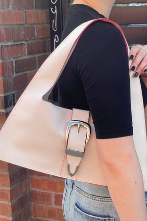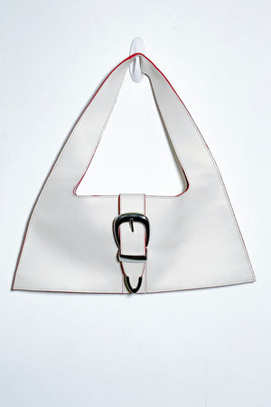 The Gigi in White- simple yet sexy in structure, made in smooth cowhide. Unlined with a magnetic closure and a 3-piece silver buckle set imported from Italy for a belt-closure feature. White leather with a fun red edge-paint detail