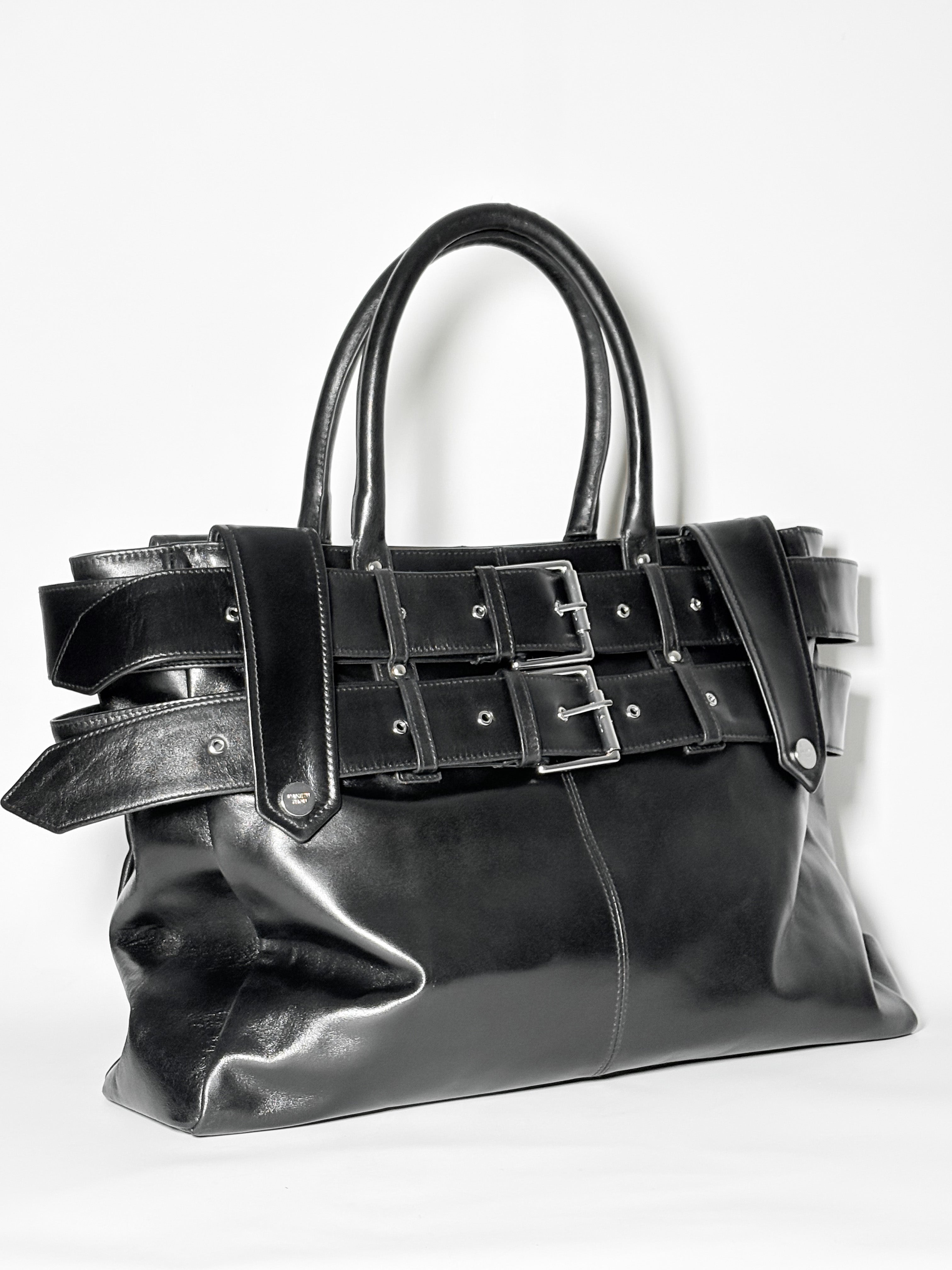 Double-belts with metal roller buckles & grommets that can be adjusted to alter the shape of the bag.